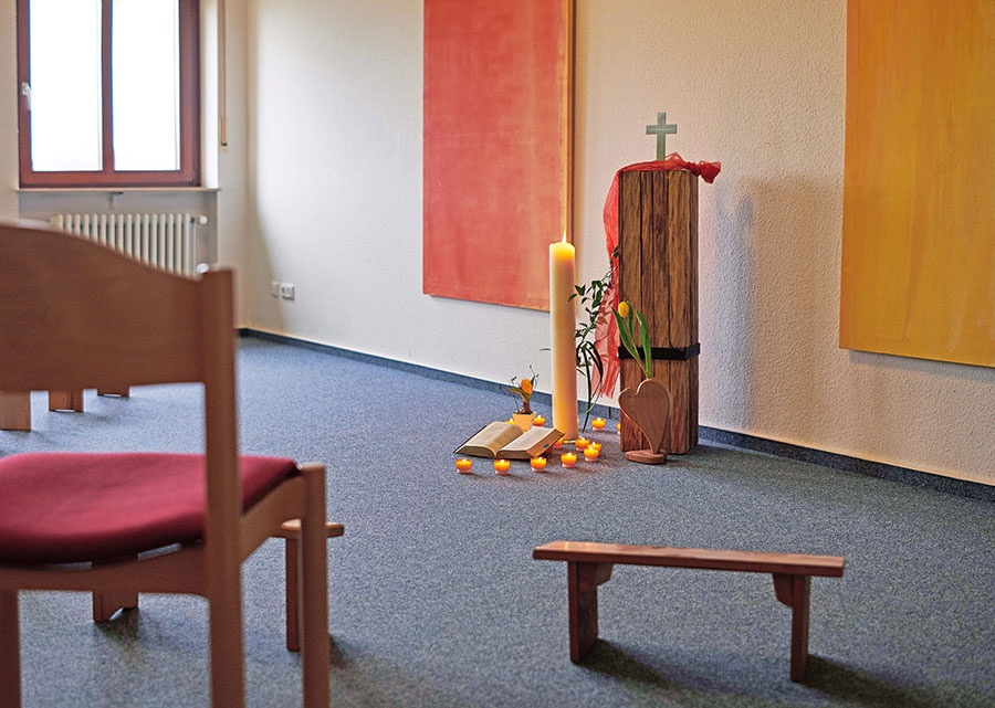 Die Deckenbeleuchtung bietet vielfältige Gestaltungsmöglichkeiten mit direktem und indirektem Licht. Der Raum ist ideal auch als Meditations- und Entspannungsraum sowie für pädagogisch / psychologische Angebote geeignet.