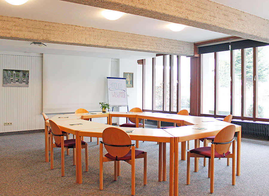 Der helle Seminarraum 4 eignet sich für Tagungen mit viel Rückzugsbedarf. Der Tagungsraum liegt mit Blick auf die Straße und das Wäldchen. Für Kleingruppenarbeit ist der nahegelegene Konferenzraum 8 ideal.
